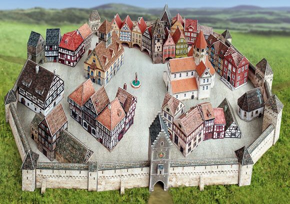 The Model Sheet contains 30 houses, a town hall, a church, a fountain and parts of the town wall with towers. Some buildings can be provided with optional building parts. With this set, it is possible for everyone to put together their own small townscape. But it is also suitable for model railways in the frame size Z.