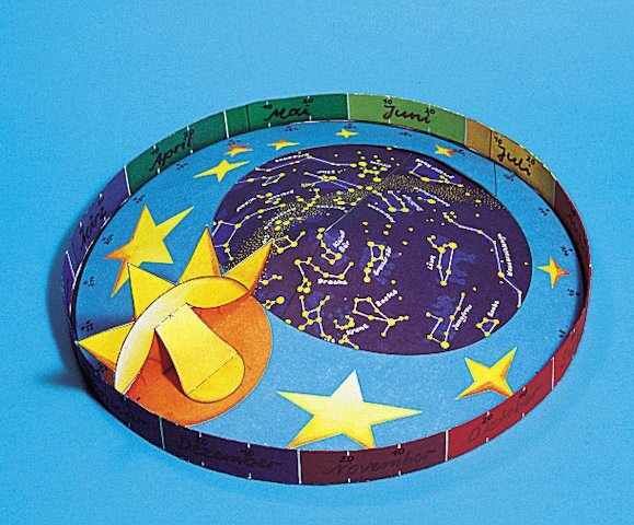 Firstly find the time of day on the inner disc. Now turn this disc until the time of day corresponds with the date on the outer edge. Then you will see on the star card exactly those constellations which are actually in the sky on the day in question at the indicated time. You only have to think that you are wearing the card. In other words, the stars at the edge of the card are on the horizon in the respective direction. And the stars in the centre are in the sky far above you.