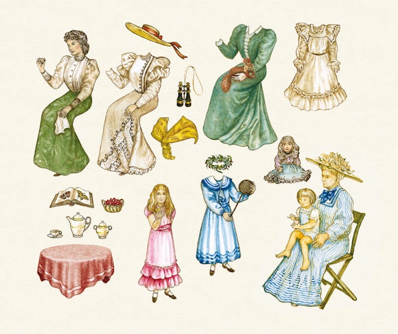 This is a new paper dolls’ sheet in a historical design. The scenes at the beach and in the artist’s studio are splendid and there are various figures for dressing.
