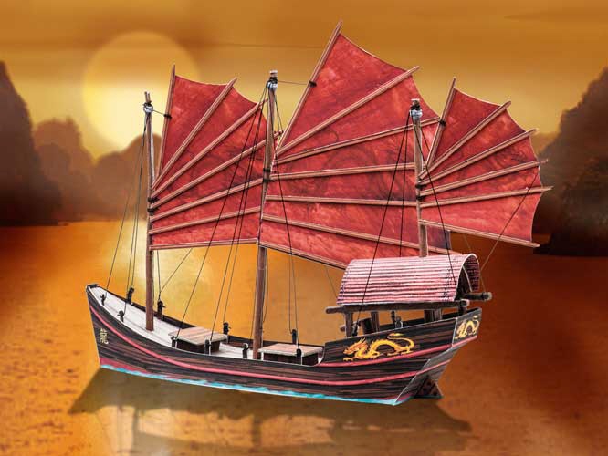 The pretty little model has three masts with the characteristic sails. Large and small junks sailed for centuries in Asia on rivers, lakes and the sea. Marco Polo also sailed on a junk on the way back from China.