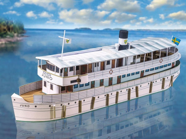 The Swedish flag flies at the stern of the MS Juno, because it sails in Sweden on the Göta Canal with its 58 locks. It is the world’s oldest passenger ship offering overnight accommodation. As a waterline model, one could also imagine this pretty ship on a model railway layout.